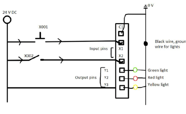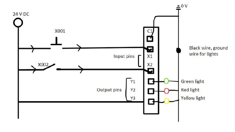 First we have our physical port or address on PLC X001, which is connected to a push-button, when pressed it will start the green light (Y001) which is also connected to the PLC. Something like this...