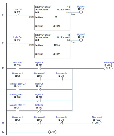 Now if you look at rung 10, you will notice that T10 is already closed. Which that means in the 8th rung, when the T10 will be activated after the delay of 1 second, it will turn off the light. So, the light will be on for 1 second, and it will go off for 0.5 seconds.