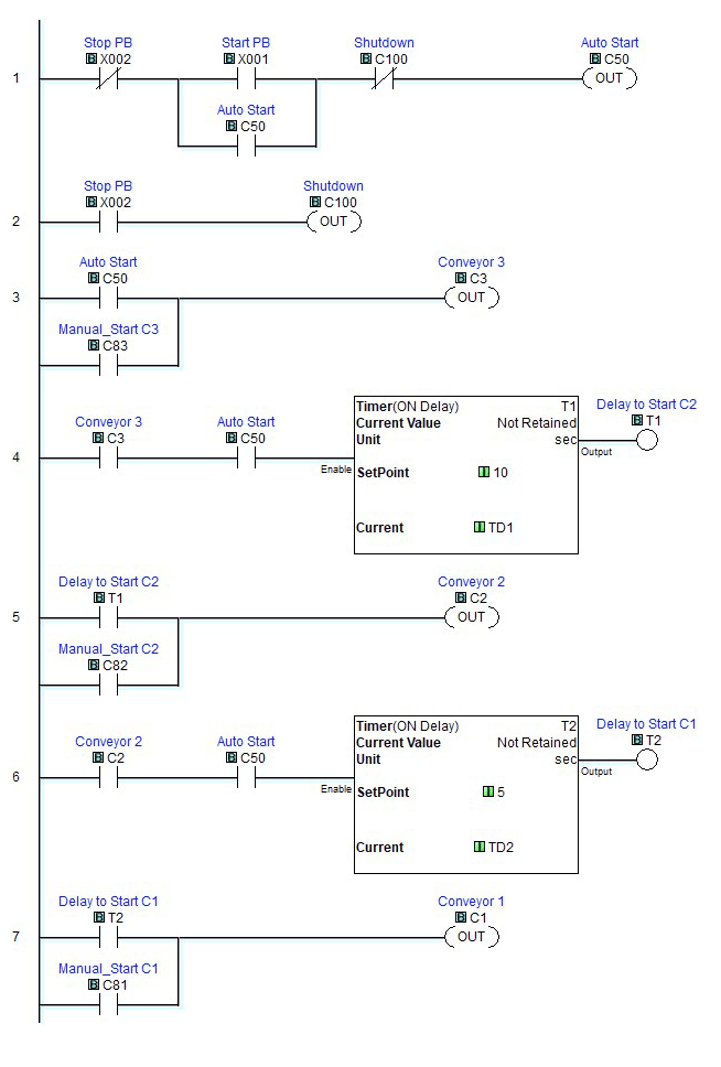 Objective: There are three conveyor belts, when a push-button is pressed we want all of them to start automatically one by one in a sequence with a delay, and while this system starts we want an indicator which shows that these belts are starting, and another indicator when the belts are successfully started. Additionally, we will need an HMI for operators to manually start each HMI.
