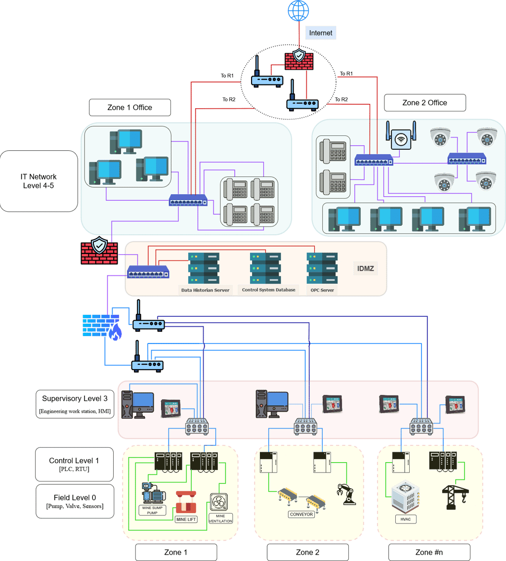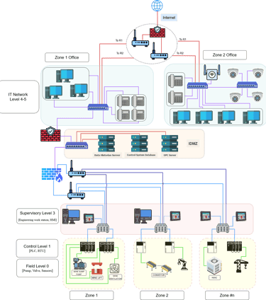 We have multiple zones or buildings which have processes going on site, and we also have IT devices. Each zone is 100-200 meters apart. Our job is to make a secure connection between the IT layer and OT layer using the Purdue model and then connect them with each other.